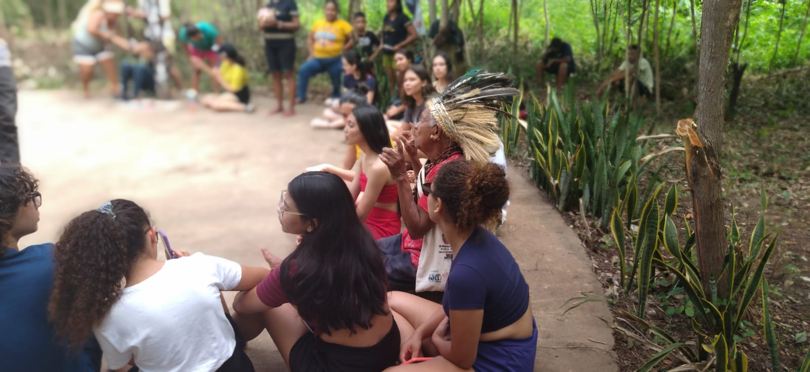 Foto: alunos, professores e pajé posando para foto.