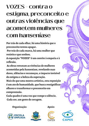 A Universidade Federal do Delta do Parnaíba (UFDPar), por meio do Projeto Escola Ampliada, em parceria com o Centro de Inteligência em Agravos Tropicais Emergentes e Negligenciados (CIATEN), realiza no dia 21 de outubro de 2025, no Parnaíba Shopping, a Exposição “VOZES – contra o estigma, preconceito e outras violências que acometem mulheres com hanseníase”.