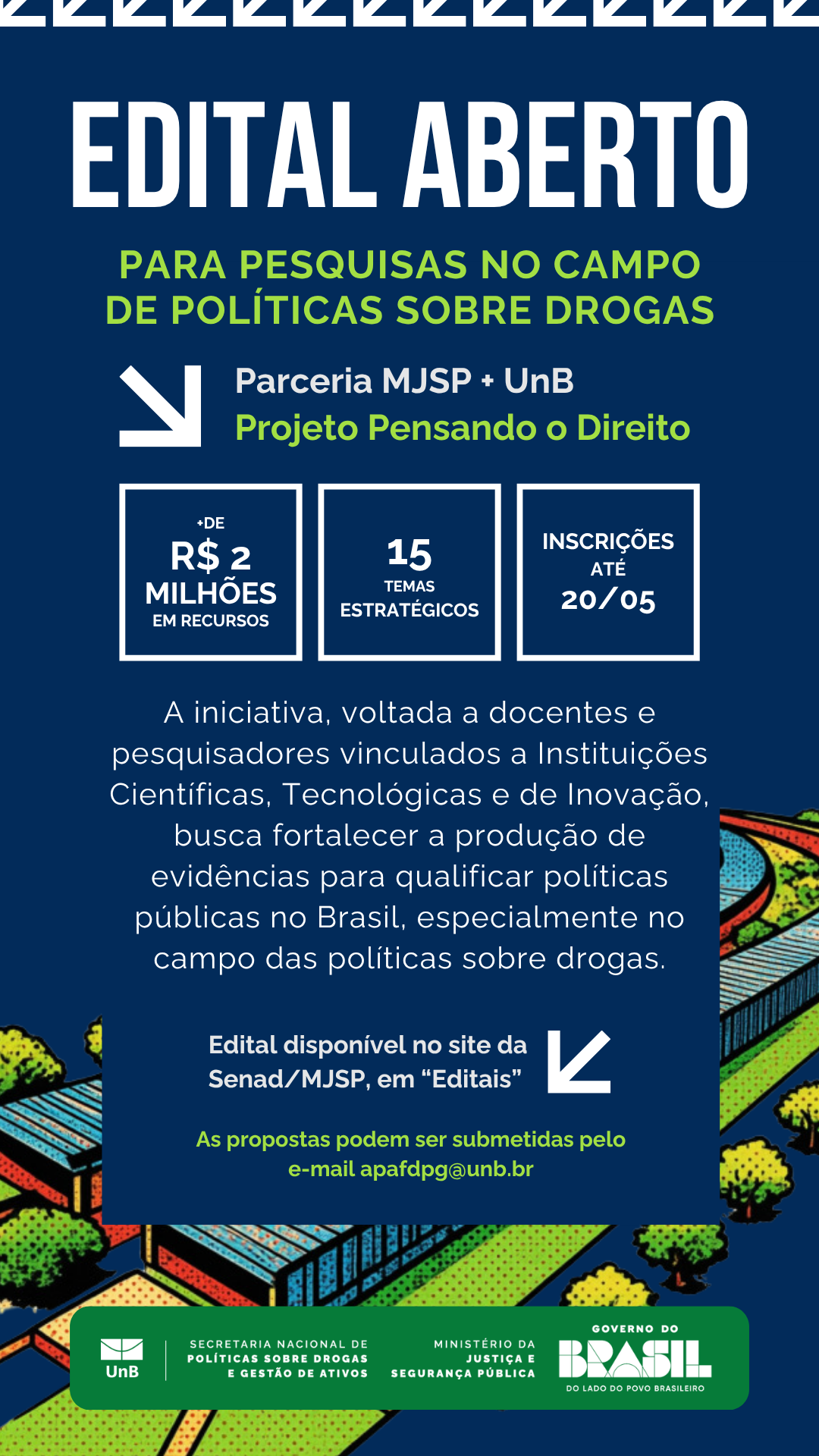 O Ministério da Justiça e Segurança Pública (MJSP), em parceria com a Universidade de Brasília (UnB), lançou o edital de pesquisa “Pensando o Direito – Política sobre Drogas”, iniciativa que busca incentivar a produção científica e o desenvolvimento de estudos voltados à formulação de políticas públicas no país.