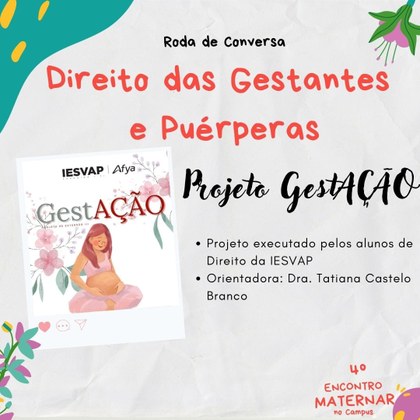 Na oportunidade, haverá a participação dos alunos do Instituto de Educação Superior do Vale do Parnaíba (IESVAP) que fazem parte do Projeto GestAÇÃO, coordenado pela Dra. Tatiana Castelo Branco. O tema do encontro será “Direito das Gestantes e Puérperas”.