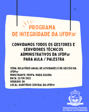 Dando continuidade as atividades para implementação do Programa de Integridade da Universidade Federal do Delta do Parnaíba (UFDPar) será realizado no dia 22 de setembro de 2022 às 8h, no Auditório Central a aula e palestra sobre "Relatório Anual de Atividades e de Gestão da UFDPar", que será ministrada pela diretora de Governança e Gestão de Recursos da UFDPar Mara Águida. O evento terá como público alvo os gestores e servidores administrativos da instituição.