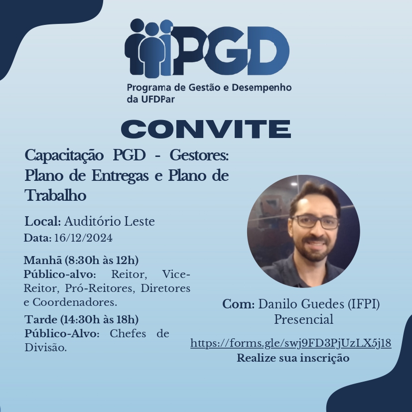 A Comissão Permanente do Programa de Gestão e Desempenho (CPPGD) convida todos os servidores da Universidade Federal do Delta do Parnaíba (UFDPar) para participar da Capacitação PGD - Plano de Entregas e Plano de Trabalho, que será ministrada pelo servidor do Instituto Federal do Piauí (IFPI), Danilo Guedes, Administrador com ampla experiência em PGD.