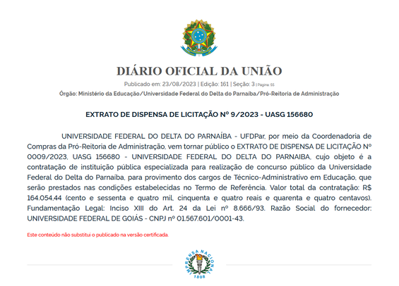 Em publicação feita no Diário Oficial da União desta quarta-feira (23/08), a escolhida para organizar e executar o concurso da UFDPar foi a Universidade Federal de Goiás – UFG. O certame ofertará oportunidades para os cargos de Técnico Administrativo em Educação, cuja notícia você acessa aqui.