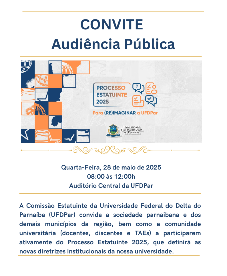 A Comissão Estatuinte da Universidade Federal do Delta do Parnaíba (UFDPar), convida a sociedade parnaibana e dos demais municípios da região a participar ativamente do Processo Estatuinte 2025, que definirá as novas diretrizes institucionais da nossa universidade.