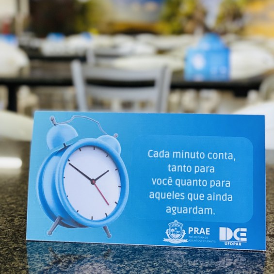A Coordenação de Assistência Estudantil do Diretório Central dos Estudantes Marielle Franco (DCE) propôs, em reunião com a Pró-Reitoria de Assuntos Estudantis através da Divisão de Alimentação e Nutrição (DAN), uma parceria para realizar uma campanha de conscientização com os usuários acerca do tempo de permanência no refeitório. Segundo a Coordenadoria, o uso adequado do tempo de permanência contribuiria na gestão do tempo de espera nas filas. Desse modo, foi idealizada a campanha “Cada Minuto no RU Conta” lançada em 09/08/2023 por meio da fixação de cartazes e sinalizadores nas paredes e mesas com os seguintes dizeres:
