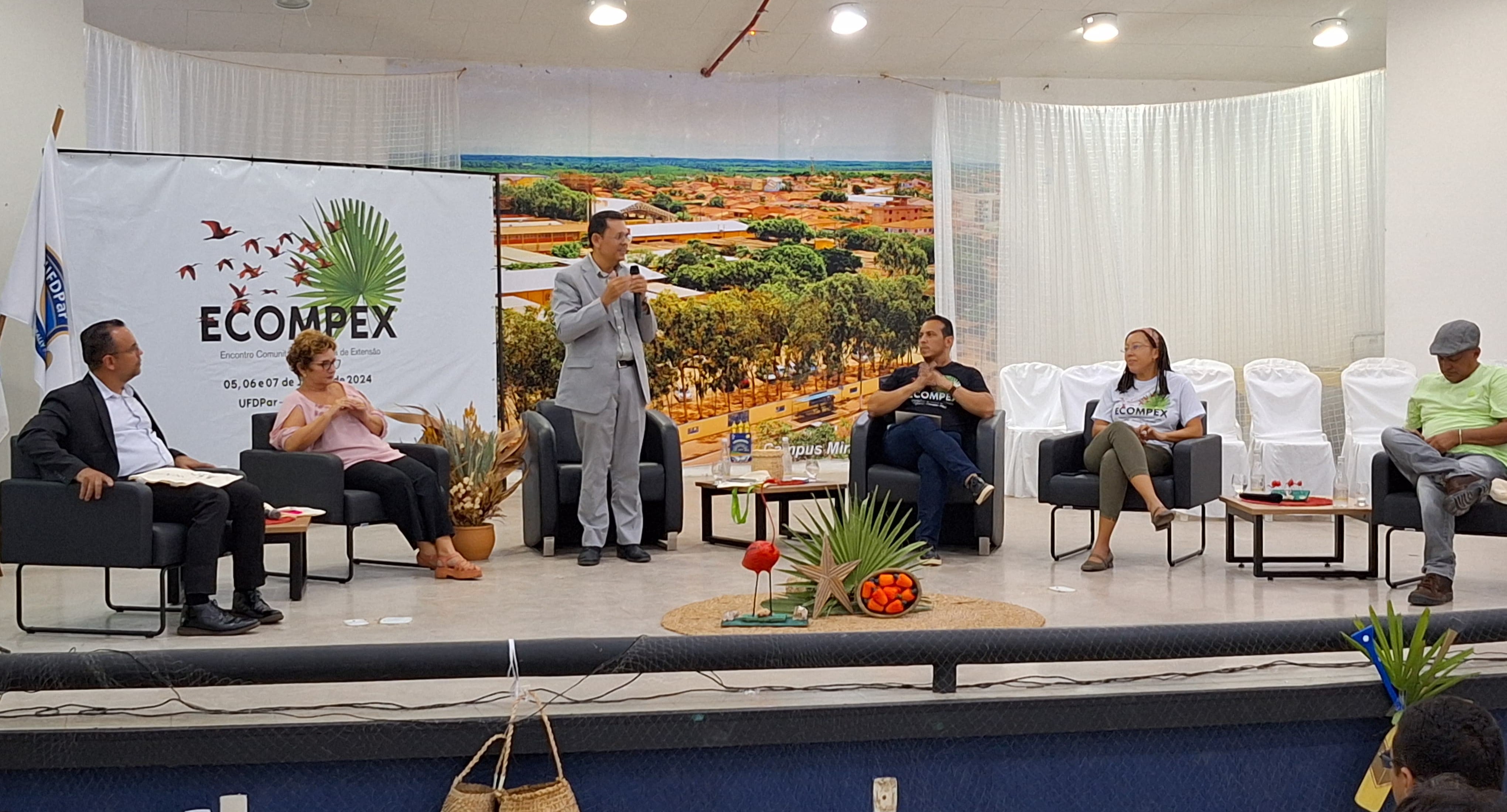 A cerimônia de abertura contou com a presença de diversas autoridades, compondo a mesa de honra. Estavam presentes o Reitor da UFDPar, Professor Doutor João Paulo Sales Macedo; o Pró-Reitor de Extensão e Cultura (PREX), Professor Doutor Francisco Jander de Sousa Nogueira; a Pró-Reitora de Graduação (PREG), Professora Doutora Eugênia Bridget Gadelha Figueiredo; a Coordenadora de Cursos e Eventos (COCEX) e do ECOMPEX 2024, Professora Doutora Carolina Silva Ribeiro; o Senhor Alisten Chaves, Coordenador de Relações Institucionais e Eventos da Fundação Cultural e de Fomento a Pesquisa, Ensino, Extensão e Inovação (FADEX); e o Representante do Movimento Social pela Pastoral da Criança e do Teatro – TACS, Senhor Jacy Luiz de Jesus Batista.
