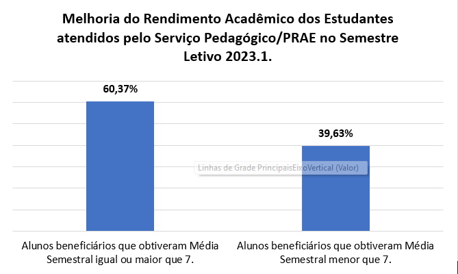 O Serviço Pedagógico (SPED) da Pró-Reitoria de Assuntos Estudantis (PRAE) realizou levantamento de dados por meio da Análise de Rendimento Acadêmico do Histórico Escolar, no período de 25/09 a 06/10, e constatou que 60,37% dos estudantes beneficiários atendidos no semestre letivo 2023.1 atingiram a Média Semestral igual ou maior que 7.