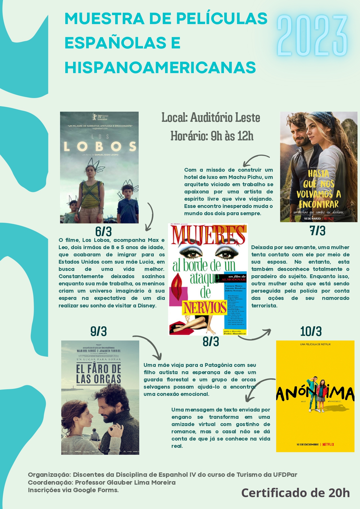As alunas da disciplina de Língua Espanhola Aplicada ao Turismo IV do curso de Bacharelado em Turismo da Universidade Federal do Delta do Parnaíba (UFDPar), sob a coordenação do professor Glauber Lima Moreira, realizam o Evento de Extensão Muestra de Películas Españolas e Hispanoamericanas.