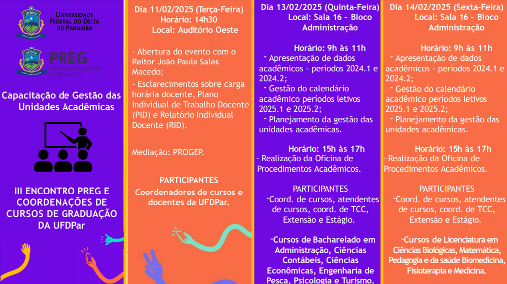 A Pró-Reitoria de Ensino de Graduação (PREG) realizará, nos dias 13 e 14 de fevereiro de 2025, o III Encontro de Capacitação de Gestão das Unidades Acadêmicas. O evento reunirá coordenadores de curso, atendentes, coordenadores de TCC, Extensão e Estágio, com o objetivo de aprimorar a gestão acadêmica e discutir os procedimentos institucionais para os períodos letivos de 2025.