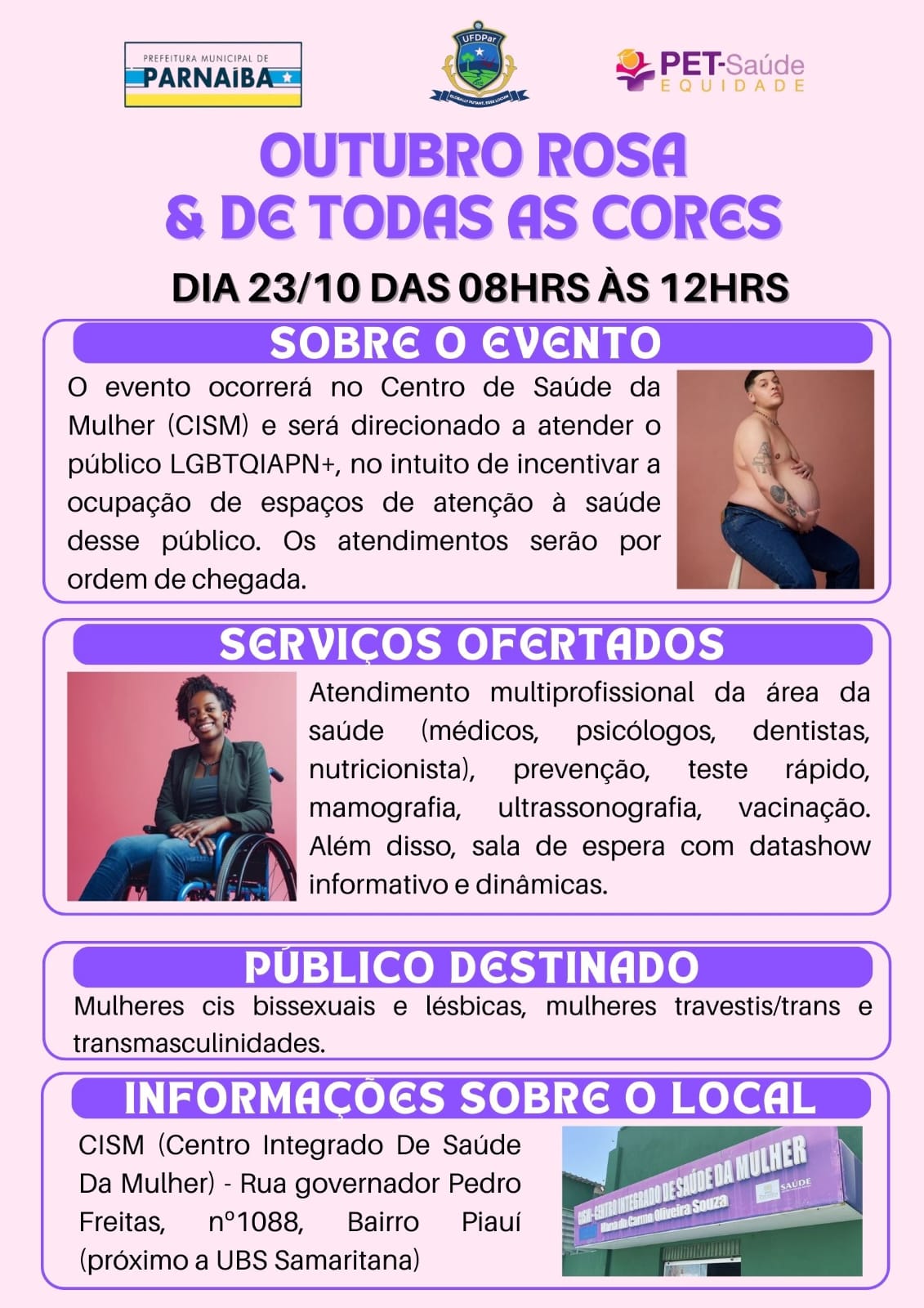 O PET - Saúde Equidade juntamente com o Centro Integrado de Saúde da Mulher (CISM) convida mulheres cis bissexuais e lésbicas, mulheres travestis/trans e transmasculinidades para participar do evento Outubro Rosa e de Todas as Cores.