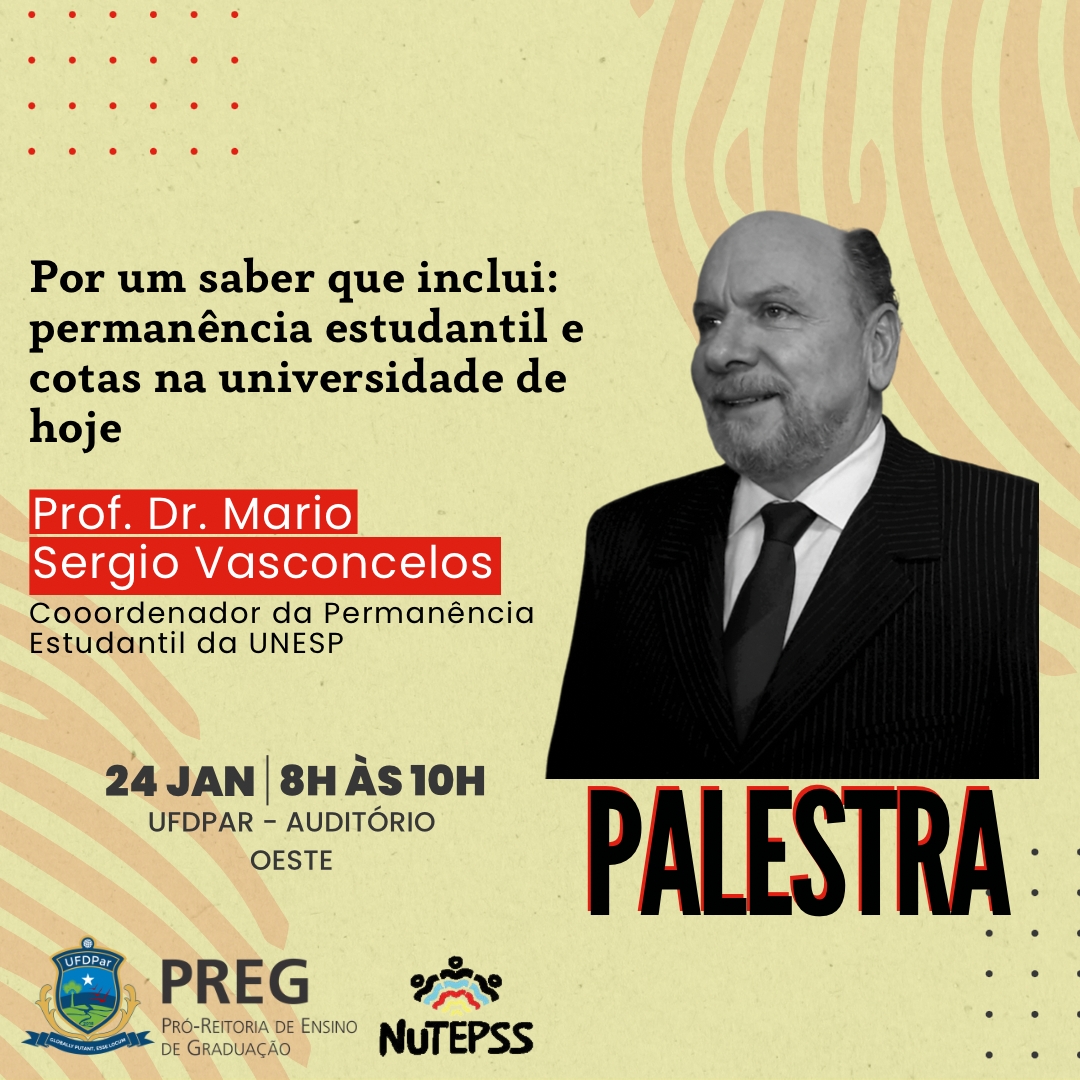 Nesta terça-feira (24/01) às 8h, será realizado a palestra “Por um saber que inclui: permanência estudantil e cotas na universidade de hoje”, pelo professor Dr. Mário Sergio Vasconcelos, Coordenador de Permanência Estudantil da UNESP. Organizado pelo Núcleo Transdisciplinar de Estudos e Pesquisas em Saúde e Subjetividade.