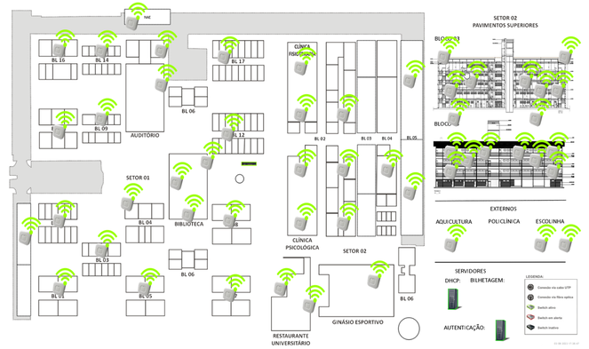 A Pró-Reitoria de Tecnologia da Informação e Comunicação (PROTIC) e a Prefeitura Universitária (PREUNI) da Universidade Federal do Delta do Parnaíba (UFDPar) executaram, até o momento (07/08/23), a instalação e a substituição de 26 novos pontos/rádios Wireless pelo Campus para corrigir e para ampliar o acesso à internet sem fio na instituição. Foram realizadas intervenções no setor 01, blocos: 01, 03, 05, 07, 08, 14; no setor 02, blocos: 03, 04, 05; RU; quadra poliesportiva; bloco do SEF e do SEP; salas de aula; e bloco dos laboratórios de pesquisa.