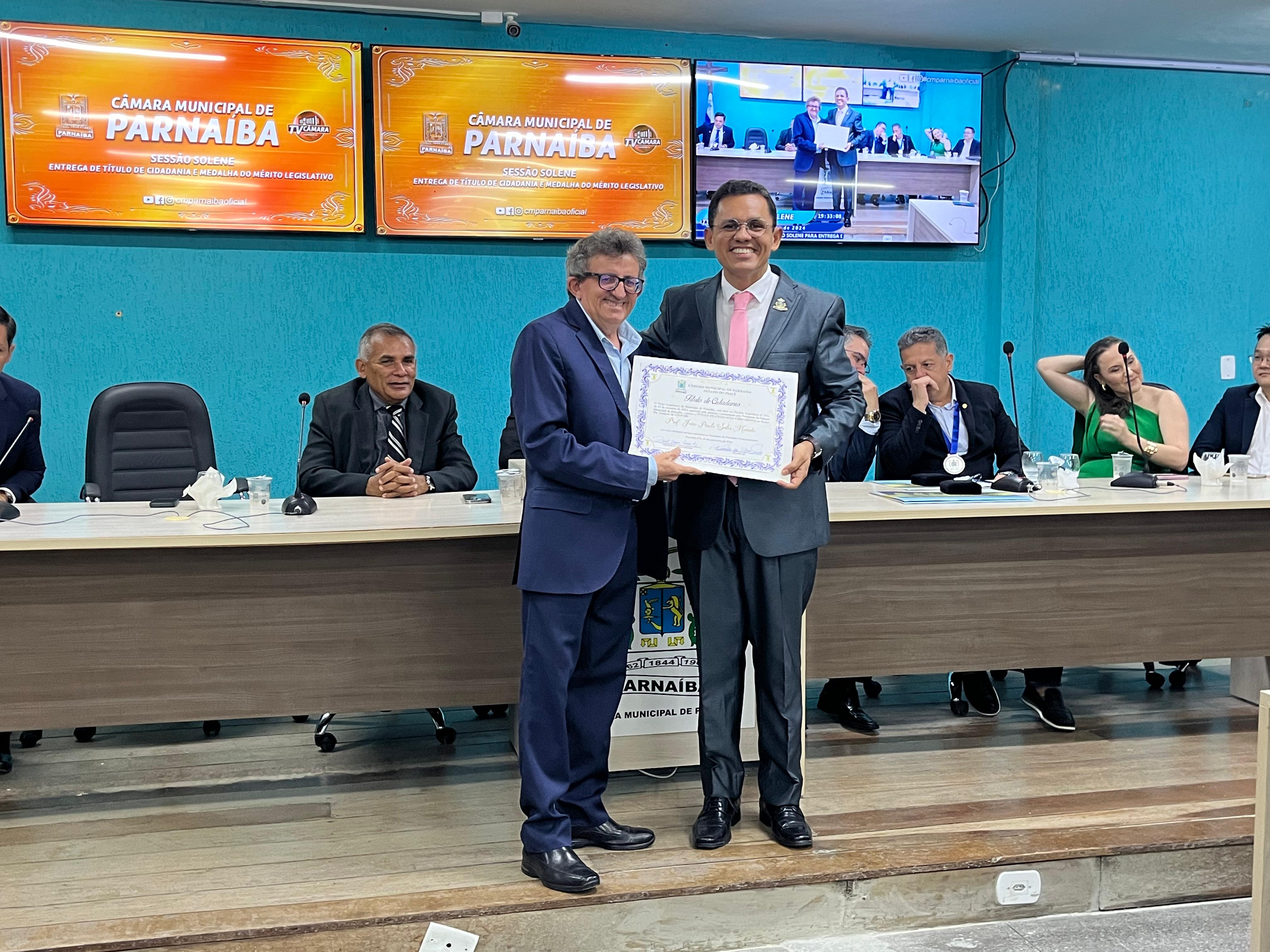 A Câmara Municipal de Parnaíba realizou na última sexta-feira, 29, uma Sessão Solene para homenagear o reitor da Universidade Federal do Delta do Parnaíba (UFDPar), Prof. Dr. João Paulo Sales Macedo. Durante a cerimônia, ele recebeu o Título de Cidadania Parnaibana e a Medalha do Mérito Legislativo Municipal “Vereador Alcenor Candeira”, em reconhecimento aos relevantes serviços prestados ao município.