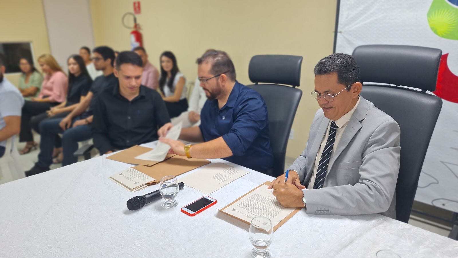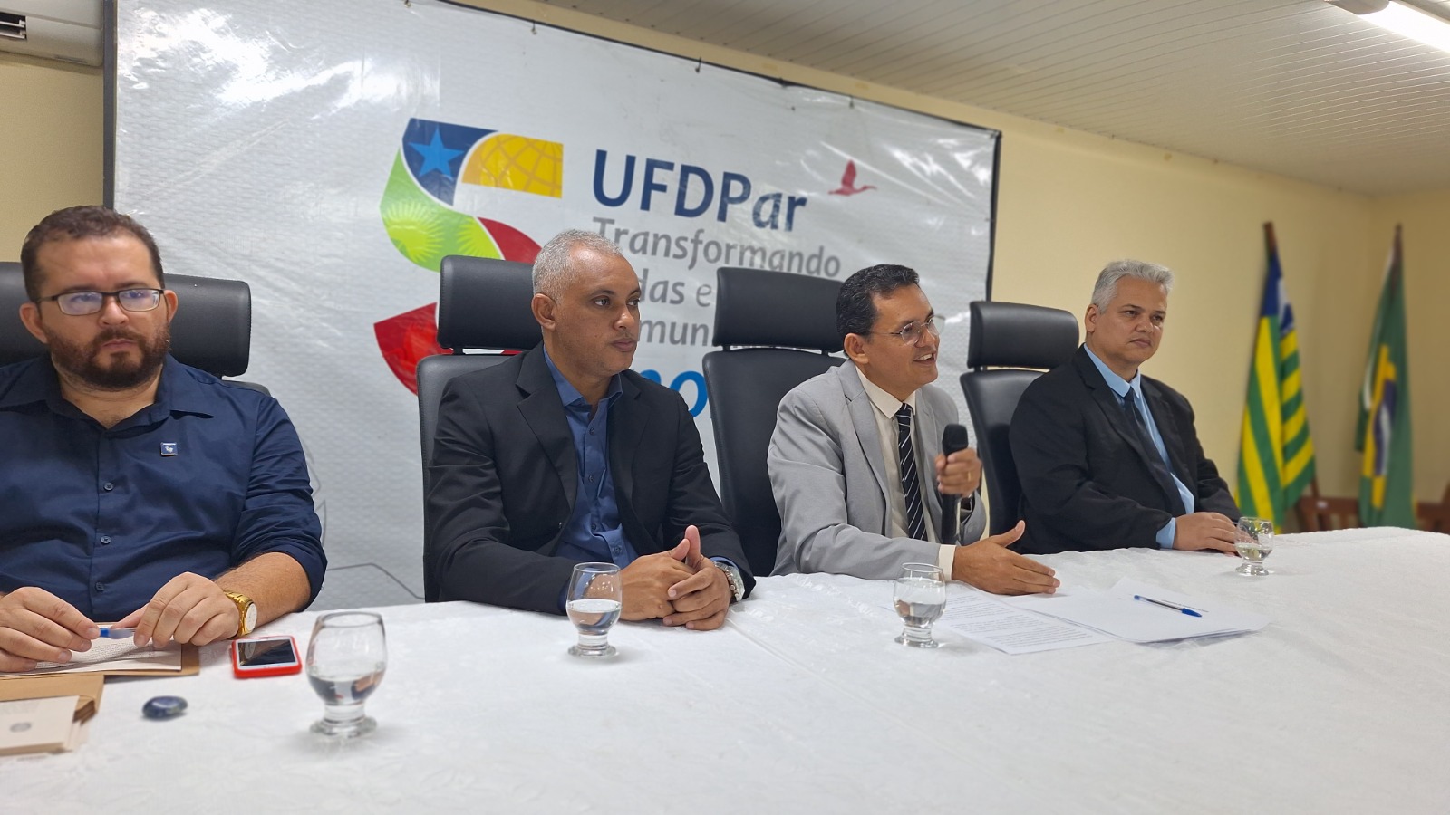 Foi realizada na manhã desta segunda-feira (25/03), a posse coletiva de mais 13 novos servidores técnico-administrativos em educação que passam a integrar o quadro da Universidade Federal do Delta do Parnaíba (UFDPar). Estes se somam aos últimos nomeados pelo primeiro concurso público realizado pela instituição no mês de novembro de 2023. O momento foi prestigiado por familiares, amigos e servidores da UFDPar. A cerimônia foi presidida pelo o Reitor João Paulo Sales Macedo, também composta pelo Vice-reitor Vicente Borges, pelo Pró-reitor de Gestão de Pessoas, Aurélio Vinícius Araújo Silva, e o Chefe da Divisão de Cadastro, Provisionamento e Controle, Jó Carlos Neves Freitas.