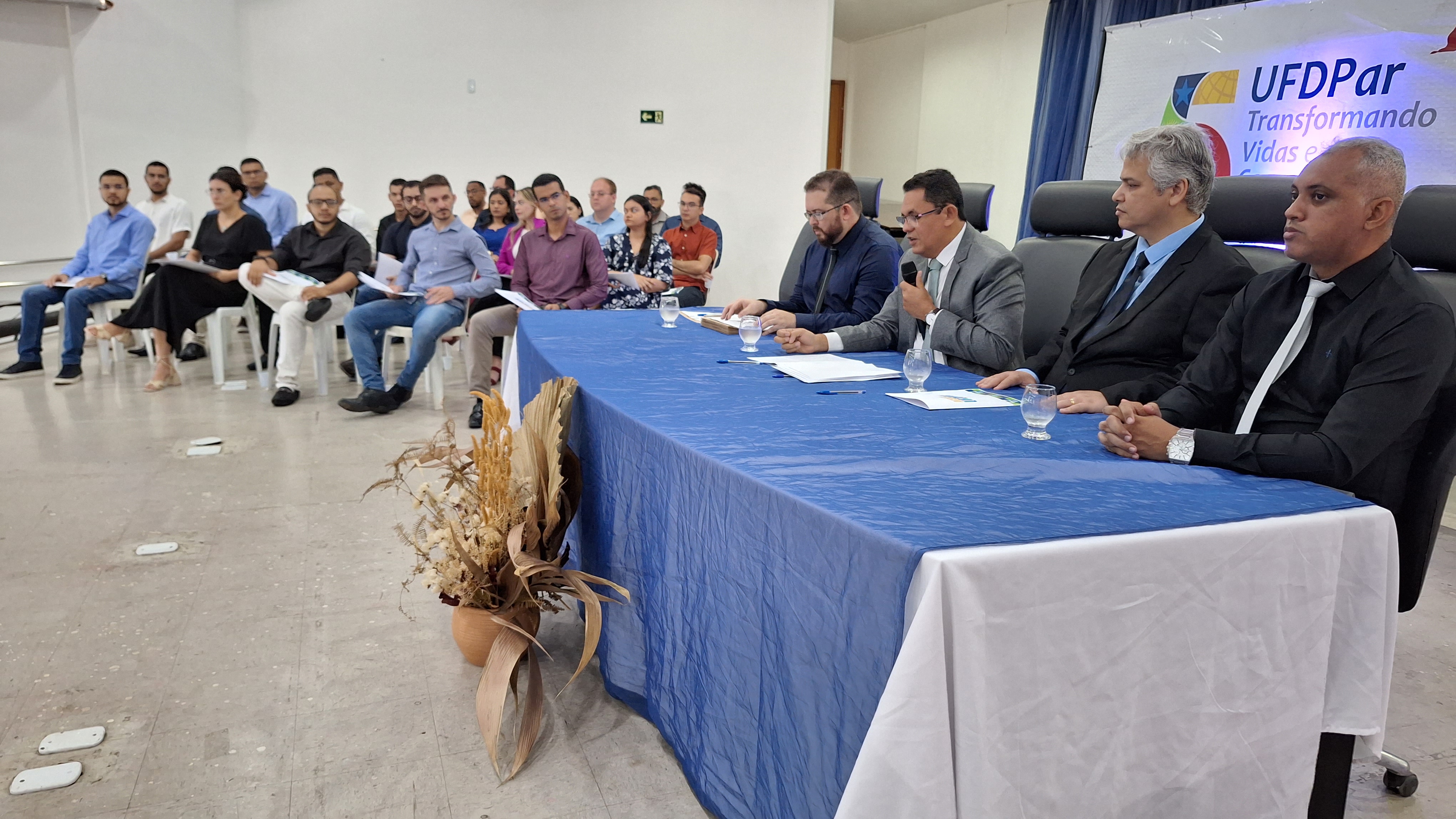 A solenidade foi presidida pelo Reitor da UFDPar, professor João Paulo Sales Macedo, que compôs a mesa de abertura da cerimônia junto ao professor Vicente de Paula Censi Borges, ao Pró-reitor de Gestão de Pessoas, Aurélio Vinícius Araújo Silva, e ao Chefe da Divisão de Cadastro, Provisionamento e Controle, Jó Carlos Neves Freitas.