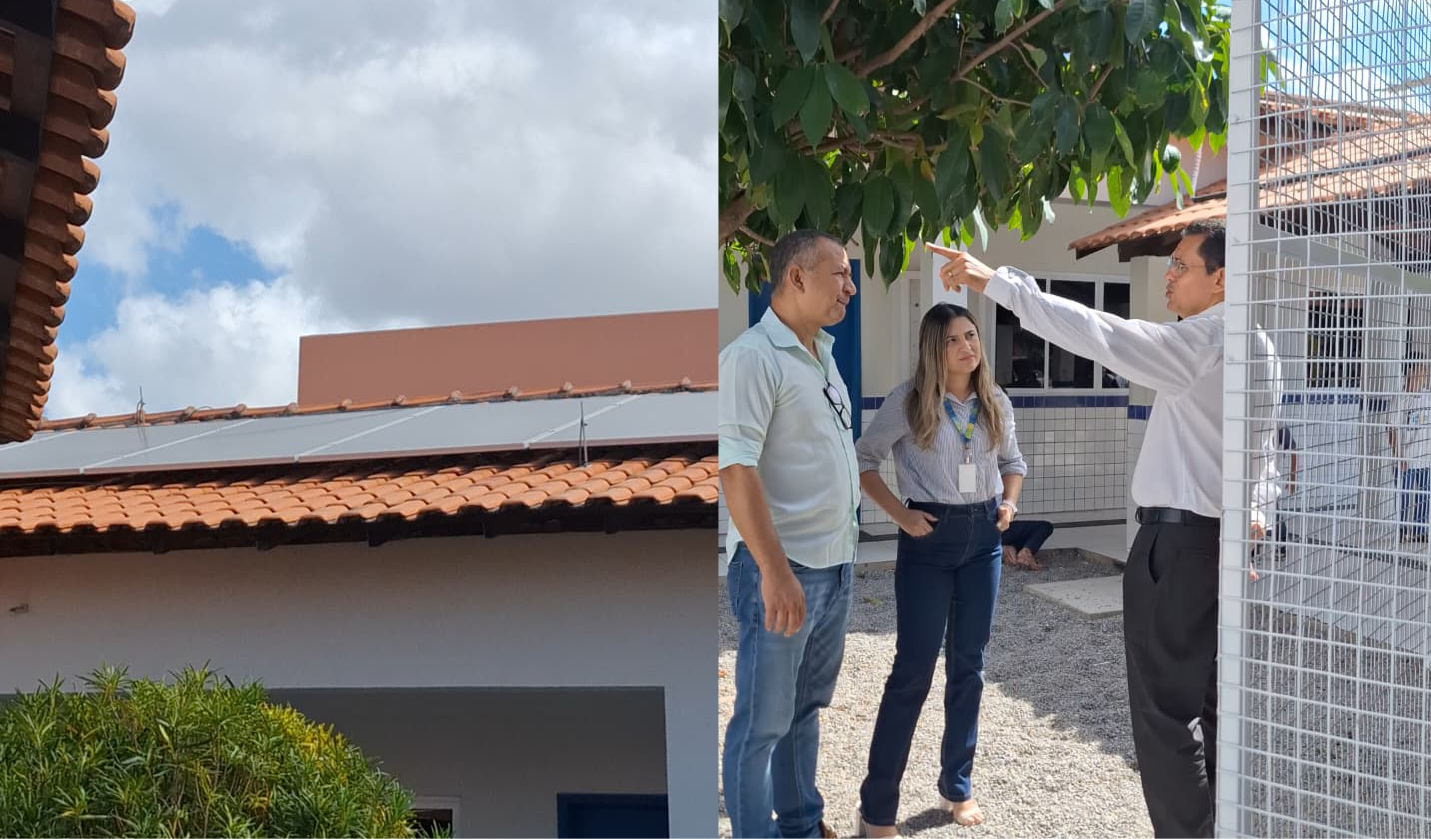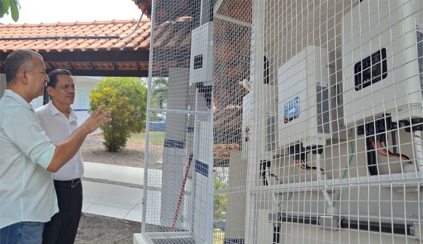Entre as ações já implementadas estão a entrega de seis refletores de LED de 50 Watts, que substituirão gradualmente os antigos refletores de vapor metálico. O ponto central do projeto, no entanto, é a instalação de uma usina solar no telhado da Escola de Aplicação, localizada na Rua Marc Jacob, no bairro São Benedito. A Usina de microgeração fotovoltaica conta com quatro inversores de 10 kW da marca DEYE e 65 módulos fotovoltaicos bifaciais de 585 Watts da marca DAH SOLAR, totalizando potência instalada de 38,03 kWpico.
