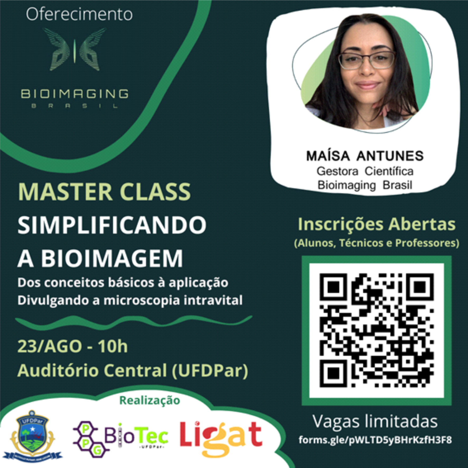 O Bioimaging Brasil, em parceria com o LIGAT, oferece a Master Class: "Simplificando a bioimagem: Dos conceitos básicos à aplicação - Divulgando a microscopia intravital".