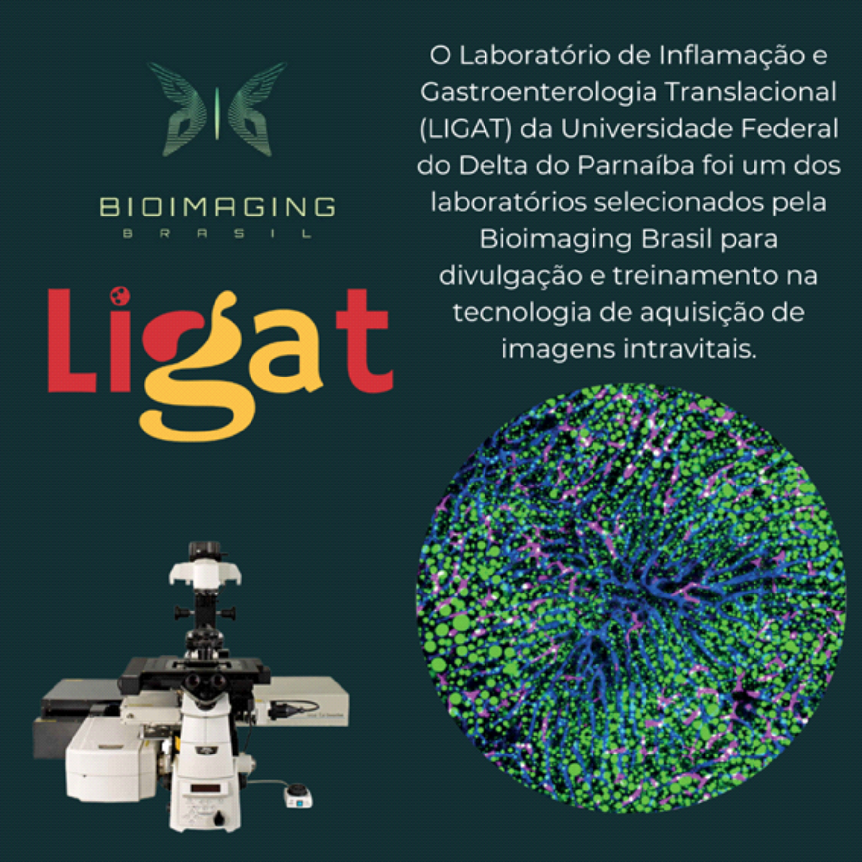 O Bioimaging Brasil selecionou o Laboratório de Inflamação e Gastroenterologia Translacional (LIGAT), da Universidade Federal do Delta do Parnaíba (UFDPar), coordenado pelos professores Dr. Jand Venes Rolim Medeiros e Dr. Lucas Antonio Duarte Nicolau como ponto de apoio para divulgação e treinamento na tecnologia de aquisição de imagens intravitais. “Projetando sempre uma melhor formação dos nossos alunos para que tenham domínio de técnicas e aumentem seus repertórios na pesquisa, vi uma excelente oportunidade em trazer o Bioimaging Brasil para a UFDPar e fico feliz em termos sido selecionados para receber a visita deste projeto de popularização de uma importante técnica de morfologia em tempo real que poderá ser usada em pesquisas relacionadas ao processo inflamatório onde podemos visualizar eventos clássicos dos leucócitos, o comportamento dos vasos sanguíneos, dentre outros. Inclusive meus alunos de graduação serão contemplados ao terem acesso à Master Class, mas também quando utilizo imagens de publicações científicas capitaneadas pelo nosso grupo de pesquisa com slides intitulados ‘Selo UFDPar de qualidade’, ao fazer alusão aos artigos oriundos do LIGAT”, explica o Professor Nicolau.