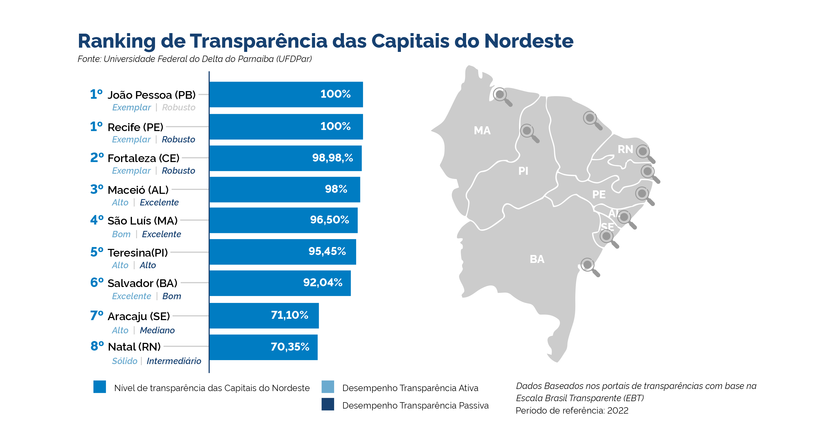 As Capitais de João Pessoa (PB) e Recife (PE) lideram o ranking com a pontuação máxima no nível de transparência, atingindo desempenho exemplar e robusto, além da inexistência de barreiras ao acesso à informação. Fortaleza (CE) aparece em segundo lugar, ficando à frente de Maceió, que teve seu desempenho considerado alto e excelente. Na última posição está Natal (RN), atingindo um desempenho sólido e intermediário.