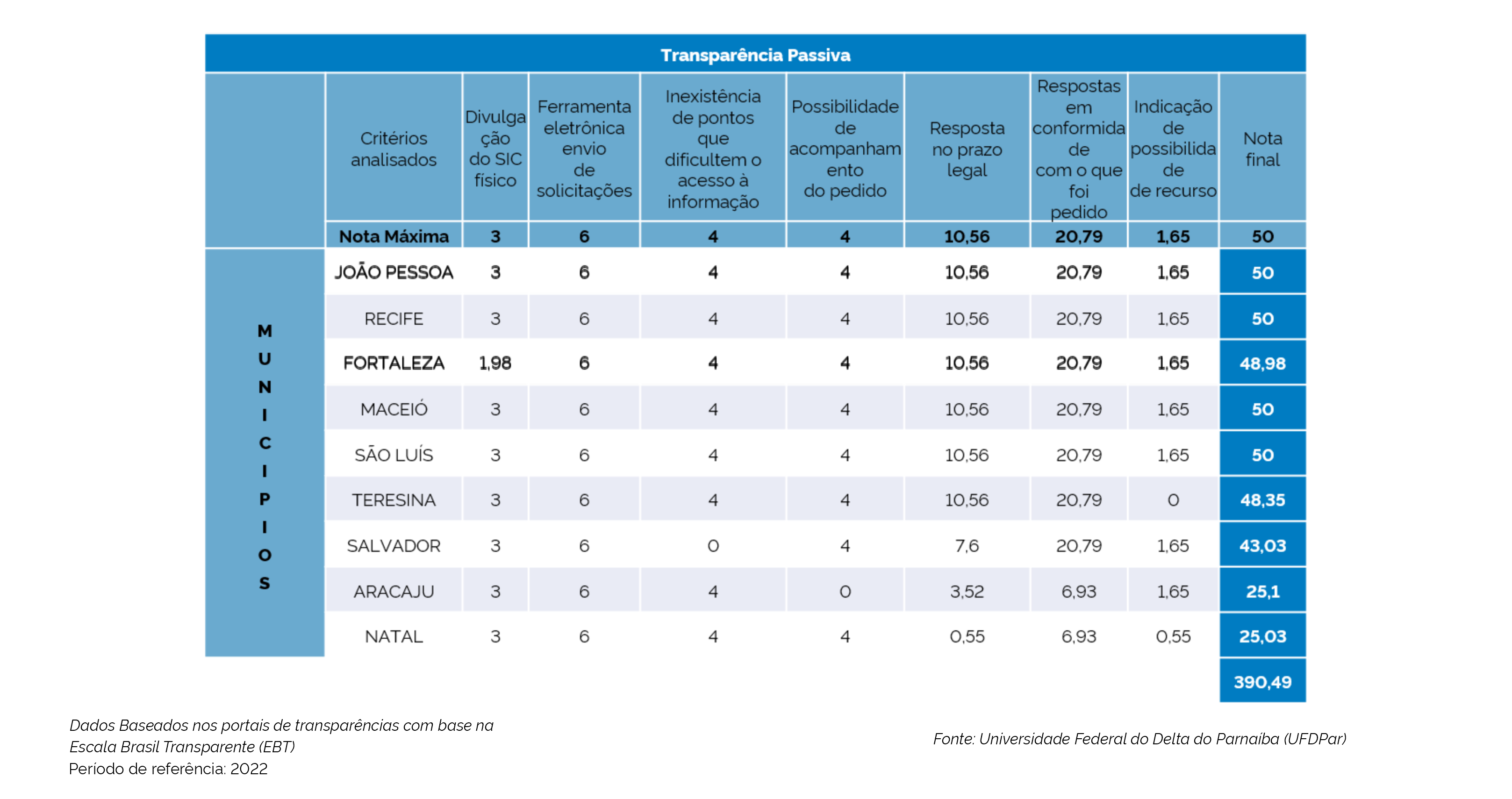 Um estudo realizado pela Universidade Federal do Delta do Parnaíba (UFDPar) apresentado em julho de 2024, elaborou um ranking de transparência das nove capitais nordestinas avaliando e descrevendo o nível de transparência pública. O trabalho de conclusão de curso orientado pelos professores do curso de Ciências Contábeis, Ana Clara Batista Sampaio, Mestra em Gestão Pública, e Alex Ferreira Lopes, Mestre em Ciências Contábeis, analisou informações disponibilizadas pelos portais de transparência com base na Escala Brasil Transparente (EBT), uma ferramenta gerida pela Controladoria-Geral da União (CGU) que permite a sociedade acompanhar o uso dos recursos públicos.