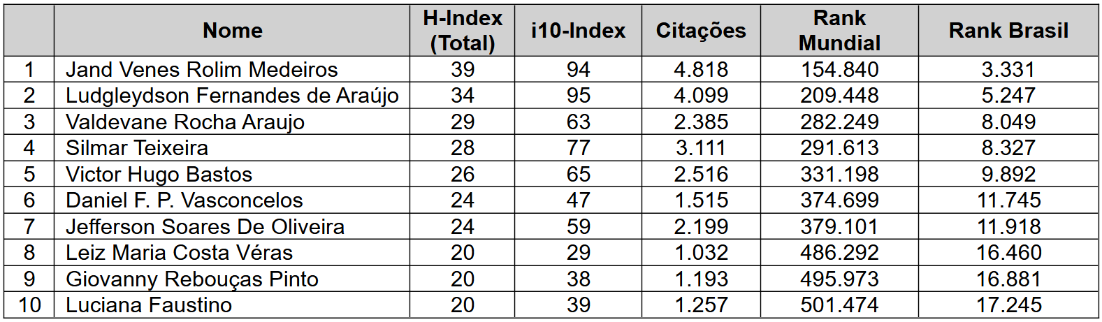 A UFDPar aparece com 33 pesquisadores listados, alguns destacam-se por estarem entre os 10 mil mais bem colocados do Brasil. Abaixo, os dez mais bem posicionados: