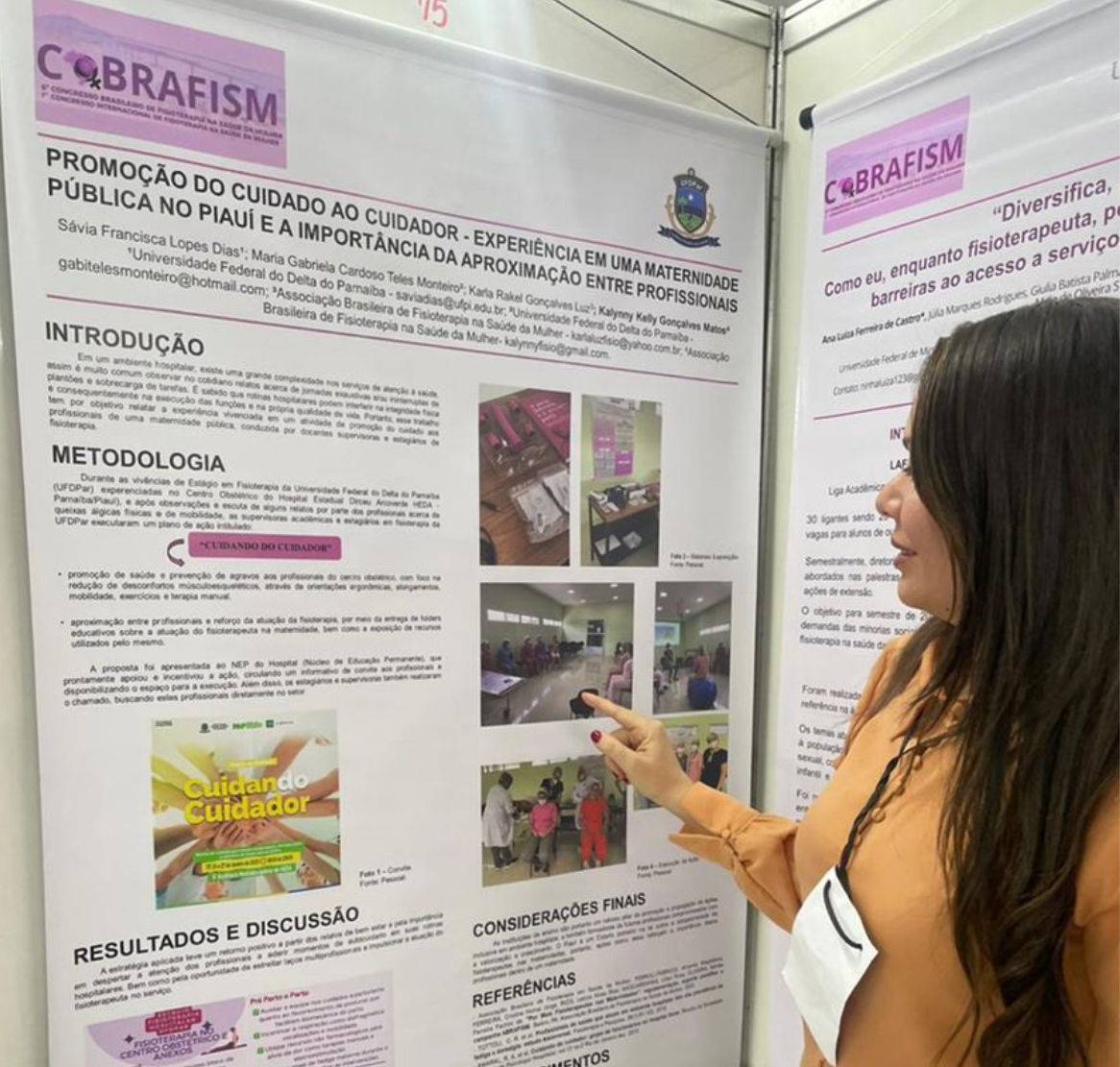 Além deste, foram apresentados os trabalhos "Vivência em uma Maternidade Pública no Piauí e a Importância da Relação Acadêmica com o Serviço Hospitalar: Um Relato de Experiência" e "Promoção do Cuidado ao Cuidador - Experiência em uma Maternidade Pública no Piauí e a Importância da Aproximação entre Profissionais." Ambos os trabalhos foram desenvolvidos em parceria com o Núcleo de Educação Permanente (NEP) do HEDA e o Centro Obstétrico HEDA. As apresentações foram conduzidas pelas Fisioterapeutas Kallyny Matos, integrante da comissão de obstetrícia da ABRAFISM, e Karla Luz, integrante da câmara técnica de Saúde da Mulher do Crefito14.