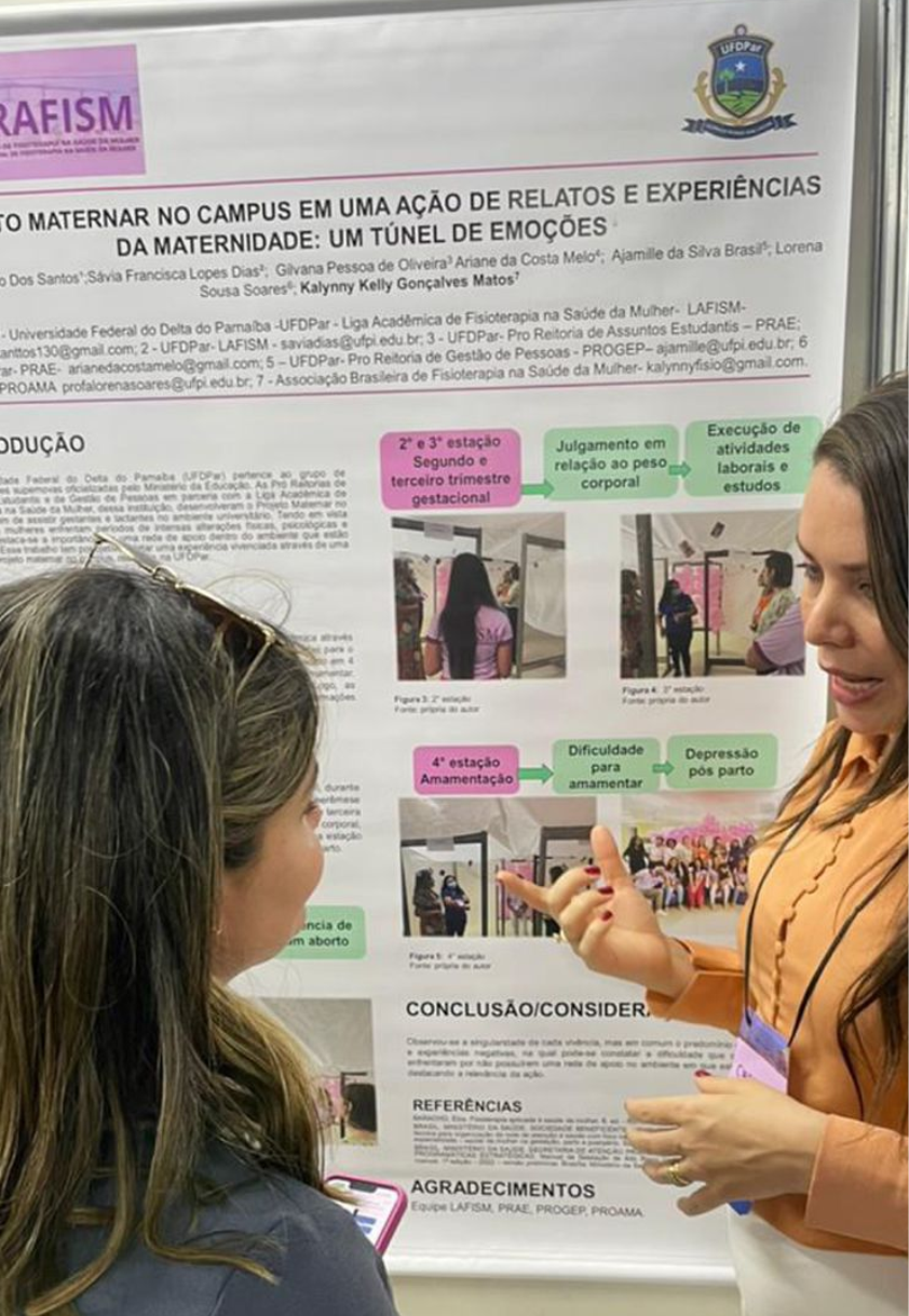 No evento, foram apresentados três trabalhos científicos orientados pela Profª Dra. Sávia Dias e Profª. Ma. Gabriela Teles, ambas do Curso de Fisioterapia, todos relacionados à área temática de Obstetrícia. O trabalho "Projeto Maternar no Campus: Uma Jornada de Relatos e Experiências da Maternidade" foi desenvolvido em colaboração com a LAFISM, PROGEP, PRAE e PROAMA.