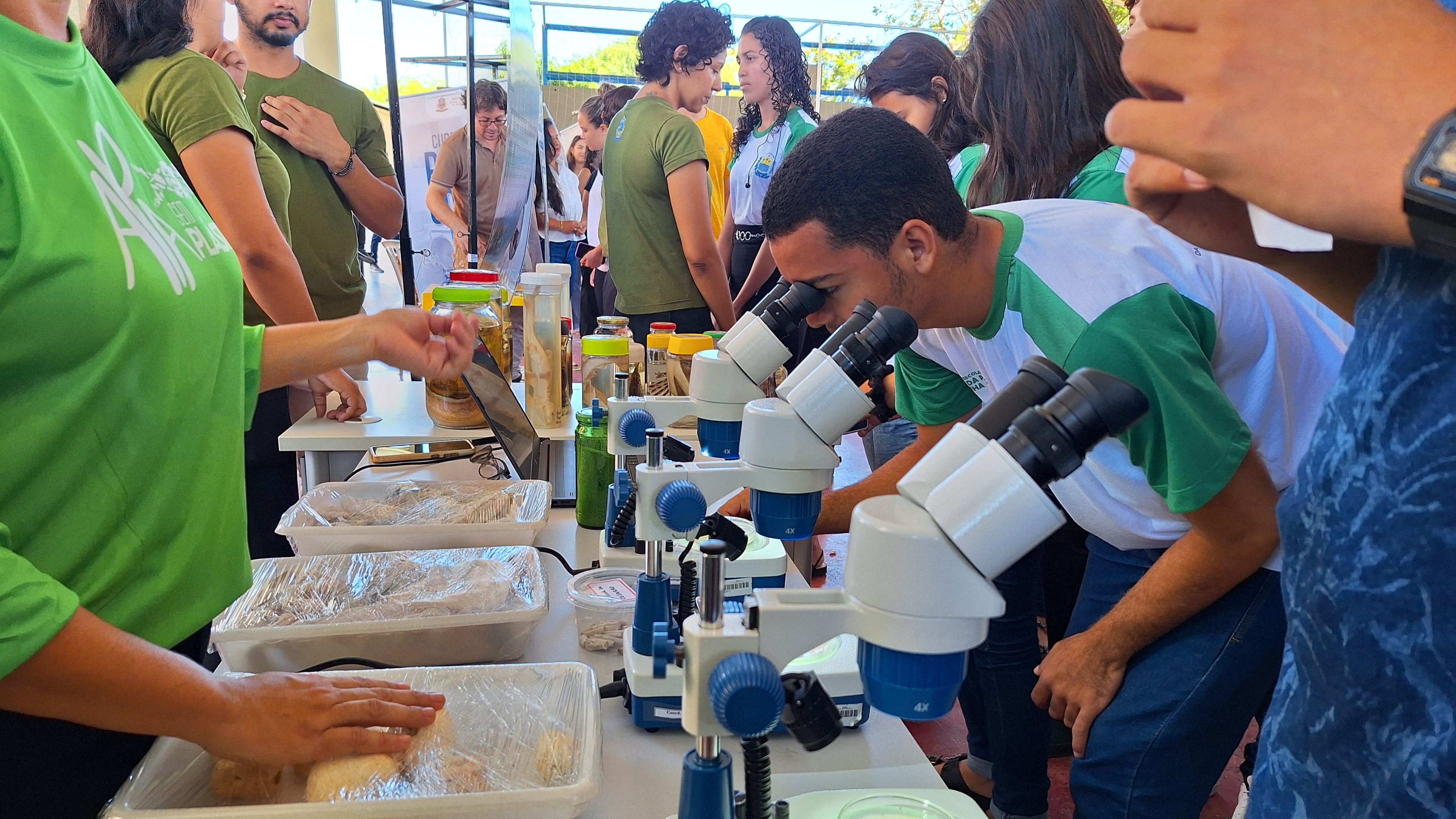 Foto: Alunos puderam observar microplásticos através de microscópios durante a feira.
