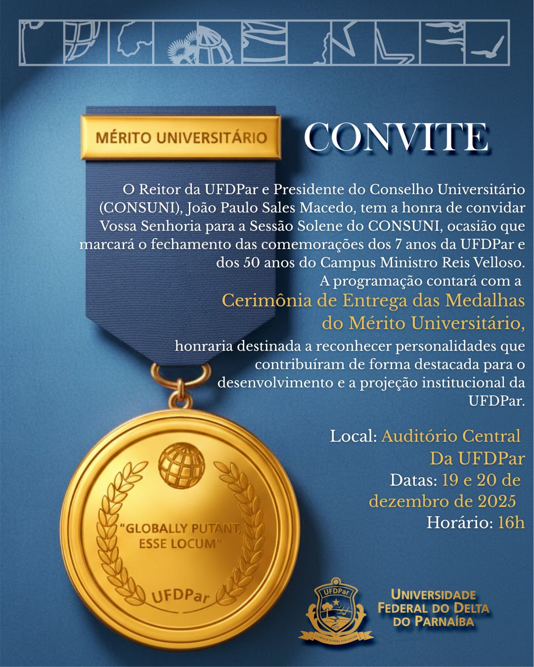 A Universidade Federal do Delta do Parnaíba (UFDPar) convida a comunidade acadêmica e a sociedade para participar da Sessão Solene do Conselho Universitário (CONSUNI), presidida pelo Reitor João Paulo Sales Macedo. O evento marca o encerramento das celebrações pelos 7 anos da UFDPar e pelos 50 anos do Campus Ministro Reis Velloso.