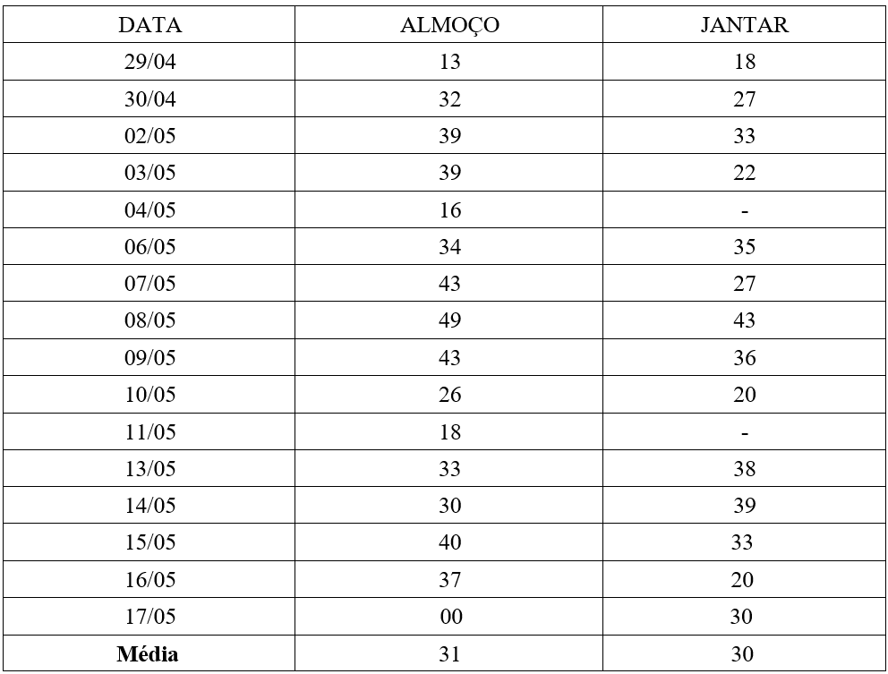 A média de acesso foi de 33 refeições no almoço e 30 refeições no jantar. Na tabela abaixo, apresentamos os registros de acesso dos discentes contemplados: