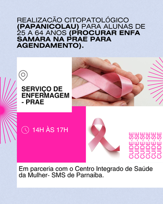 Em alusão à campanha Outubro Rosa, o Serviço Médico e de Enfermagem da Pró-Reitoria de Assuntos Estudantis (PRAE) reforça o convite às alunas da Universidade Federal do Delta do Parnaíba (UFDPar), com idades entre 25 e 64 anos, para a realização do exame preventivo do câncer de colo uterino (Papanicolau).