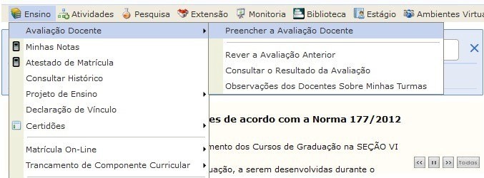 2 – No menu Ensino>Avaliação Docente>Preencher a Avaliação Docente: