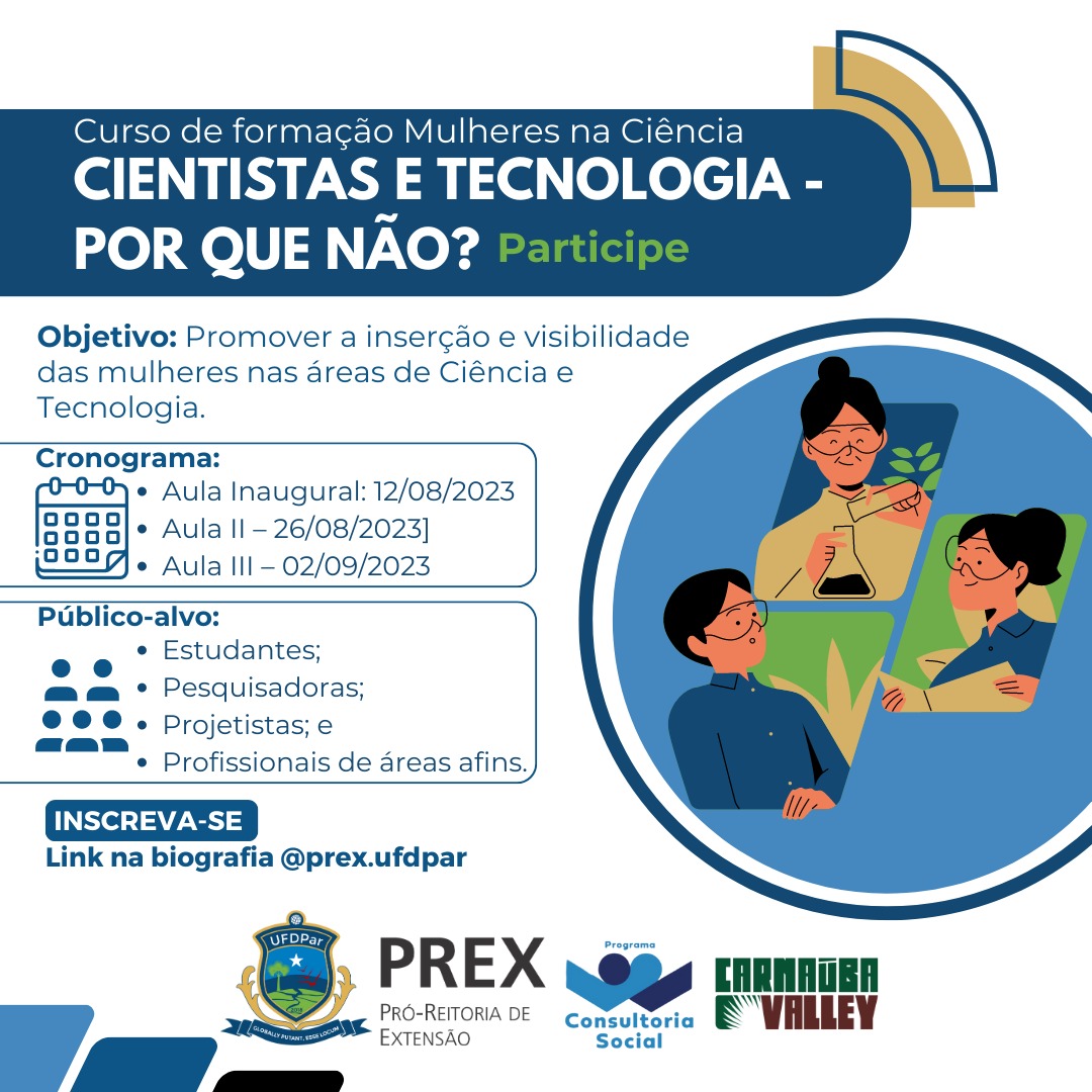 A Pró-Reitoria de Extensão (PREX) da Universidade Federal do Delta do Parnaíba (UFDPar) promoverá o "Curso de formação Mulheres da Ciência: Cientistas e Tecnologia - Por que não?", com o objetivo de promover a inserção e visibilidade das mulheres nas áreas na Ciência e Tecnologia. O público-alvo do curso inclui estudantes, pesquisadoras, projetistas e profissionais de áreas afins.
