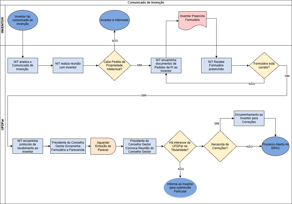 O trabalho de proteção da Propriedade Intelectual se inicia a partir da Comunicação de Invenção realizada pelos pesquisadores, docentes e alunos da UFDPar, que devem comunicar seus resultados de pesquisa com potencial para gerar novos produtos, processos e métodos por meio do Comunicação de Invenção.