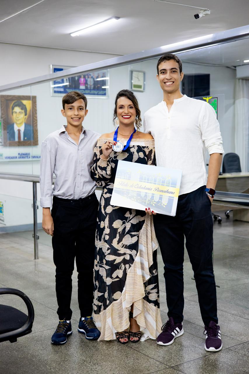 Professora Dra Patrícia Xavier Chaves e os filhos Rodrigo e Lucas Chaves Coertjens e o propositor da honraria, o Vereador Renato Bittencourt, respectivamente.