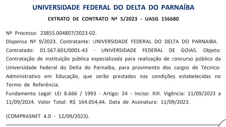 A Universidade Federal do Delta do Parnaíba comunica a contratação da banca encarregada pela realização do concurso para técnico-administrativo. Conforme extrato publicado no Diário Oficial da União, a contratada foi a Universidade Federal de Goiás, a qual ficará responsável pela organização e realização do certame.