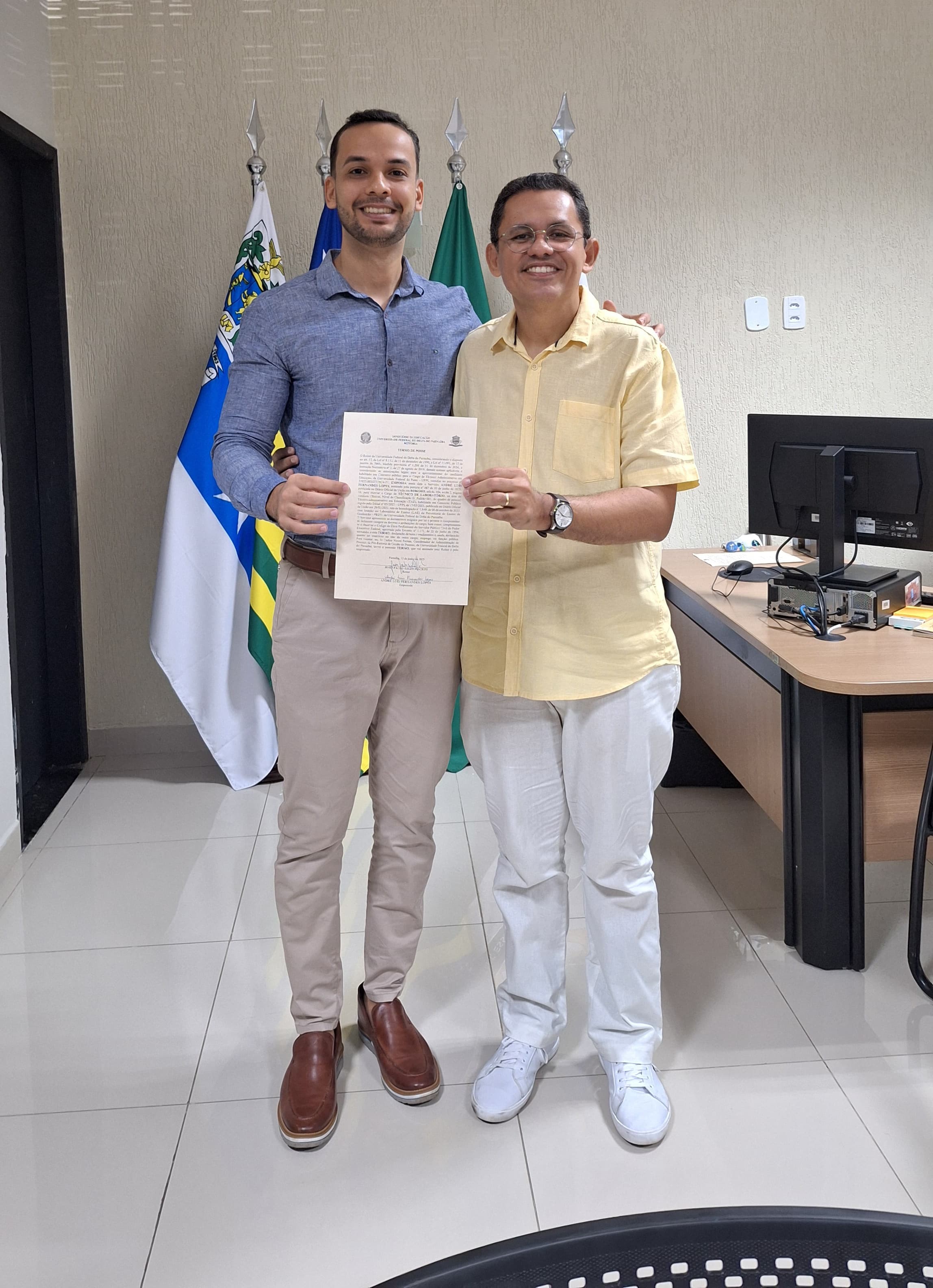 Novo servidor André Luís Fernandes Lopes e Reitor João Paulo Sales Macedo após assinatura do Termo de posse.