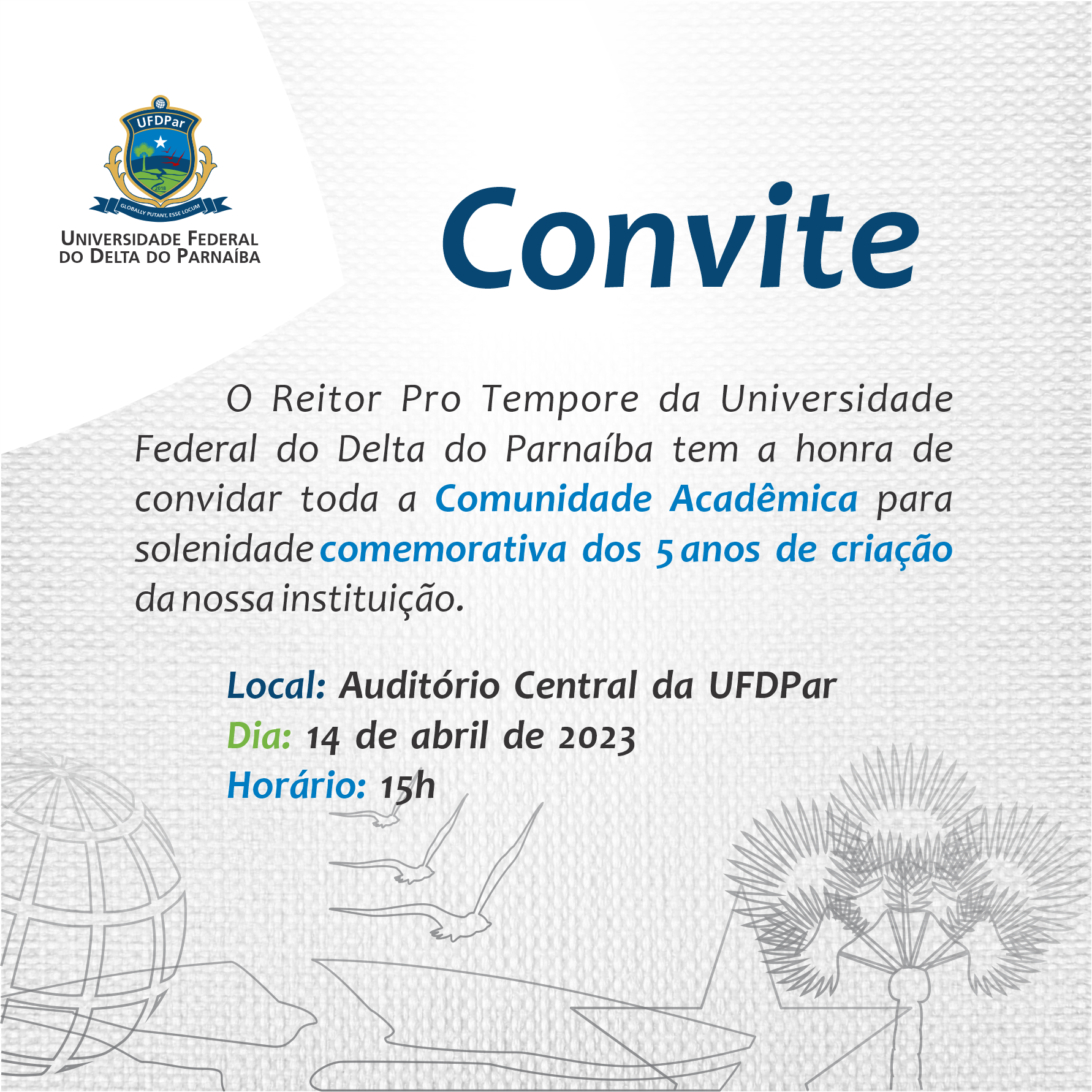 O Reitor Pro Tempore da Universidade Federal do Delta do Parnaíba tem a honra de convidar toda a comunidade Acadêmica a Vossa Senhoria para solenidade comemorativa dos 5 anos de criação da Instituição. O evento ocorrerá no dia 14 de abril de 2023, às 15h no Auditório Central do Campus.