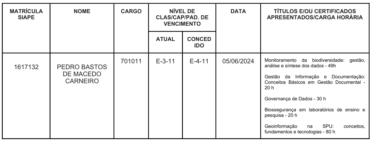 | MAT. SIAPE | NOME | CARGO | NIV/CLAS/CAPACITAÇÃO/PADRÃO DE VENCIMENTO | DATA | |