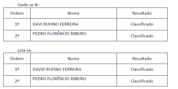 | 1º | Ana Lígia Muniz Rodrigues | Classificado(a) |