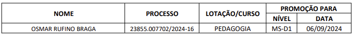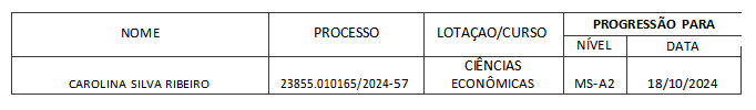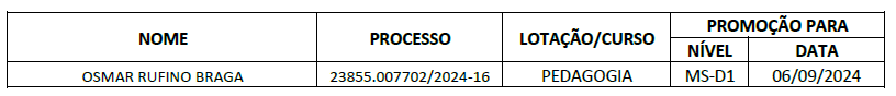 Portaria Nº 024, de 31 de Janeiro de 2024 - Conceder PROGRESSÃO FUNCIONAL POR MÉRITO PROFISSIONAL, nos termos do Decreto n°5.824/2006, de 29/06/2006; da Resolução n° 034/2007 do Conselho de Administração da UFPI, que institui o Plano de Desenvolvimento dos Integrantes do Plano de Cargos da Carreira dos Técnico-Administrativos em Educação-PDIC/TAE, da Universidade Federal do Piauí; dos artigos 11 e 12, o Anexo XV da lei n° 11.091, de 12/01/2005, com alteração da MP 431/08, publicada no DOU de 14.05.2008 e convertida na Lei n° 11.784 de 22/09/2008, publicada no DOU de 23/09/2008, aos servidores técnico-administrativos desta IFES informados na tabela abaixo, cujos efeitos financeiros retroagem às respectivas datas.
