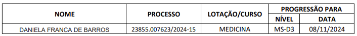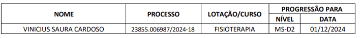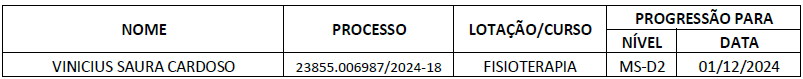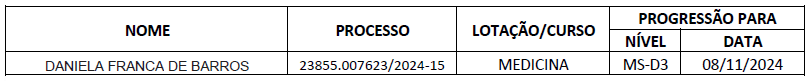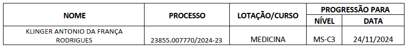 | FERNANDO LOPES E SILVA JÚNIOR | 23855.007425/2023-29 | MEDICINA | MS-C4 | 24/11/2023 |