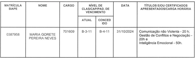 | MATRÍCULA SIAPE | NOME | CARGO | NÍVEL DE CLAS/CAP/PAD. DE VENCIMENTO | % | DATA | TÍTULO/CERTIFICADO APRESENTADO |